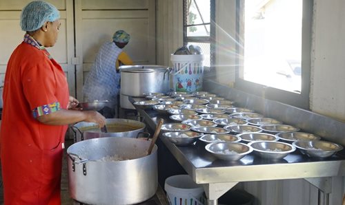FIRM FOUNDATION: School food preparers serving nutritious hot meals as part of the school nutrition programme.